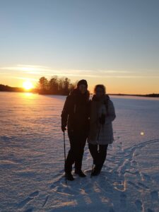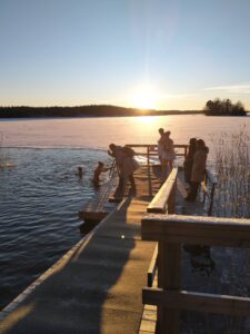 Leader Ravakan Innokkaat vapaaehtoiset opintomatkalaiset kävivät tänään vierailulla myös V-S Ladun Metsälehdon saunalla. Mukana oli vieraita Saksasta, Itävallasta ja Kroatiasta.Sauna oli tietenkin lämpimänä ja suurin osa sinne halusikin mennä, he myös kävivät avannossa eikä jäänyt yhteen kertaan. Reippaasti he menivät suoraan pukuhuoneesta kastautumaan, vaikka eivät olleet ennen avantouintia kokeilleet. Osan kanssa käveltiin jäällä ja myös se oli uusi kokemus heille. Päivä oli mitä parhain, aurinko paistoi ja auringonlasku teki suuren vaikutuksen. Lupasi osa jo tulla uudelleen Suomeen. Suuret kiitokset Leader Ravakka ja kaikki te ihanat vieraat!