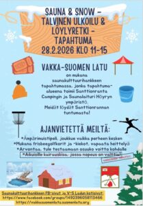 Valmistelut lauantain 28.2.2026 klo 11-15 Sauna & Snow tapahtumaa varten ovat hyvällä mallilla. Nyt vaan toivotaan, että kelit suosii niin järjestäjiä kuin tapahtumaan osallistujiakin! Muistakaahan tulla katsomaan mitä kaikkea Santtioranta Camping ja Saunalaituri Höyry ympäristöstä löytyyy! Vakka-Suomen Ladun tapahtumapaikan löydät Santtionrannasta. Nähdään lauantaina[Lue lisää »]