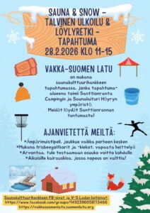 Vakka-Suomen Latu osallistuu saunakulttuurihankkeen puitteissa järjestettävään tapahtumaan, jonka tapahtuma-alueena toimii Santtionranta Camping ja Saunalaituri Höyryn ympäristö. Meidät löydät Santtionrannan tuntumasta. Ajanvietteeksi järjestämme myös ohjelmaa: Ämpärimuistipeli, pelataan joukkueena tai yksilökisana. Yhteen peliin osallistuu max. kolme joukkuetta/henkilöä. Ohje löytyy liitteenä, voittajille luvassa pientä palkitsemista. Mukana meillä on frisbeegolfkorit ja -kiekot (3 kpl koreja), vapaata heittelyä Arvontaa, 1 […][Lue lisää »]