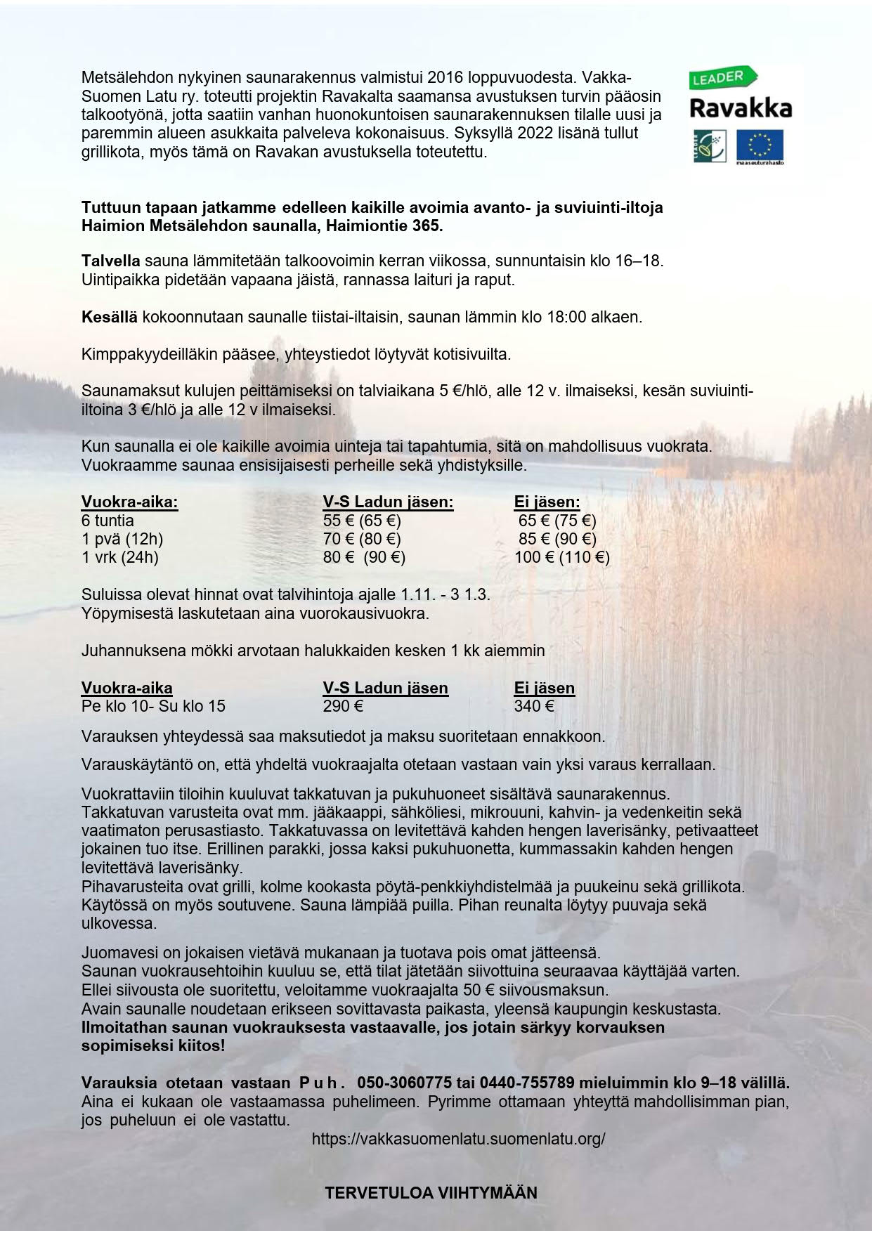 Metsälehdon saunan esite ja hinnat/ Brochure and prices for Metsälehdon sauna